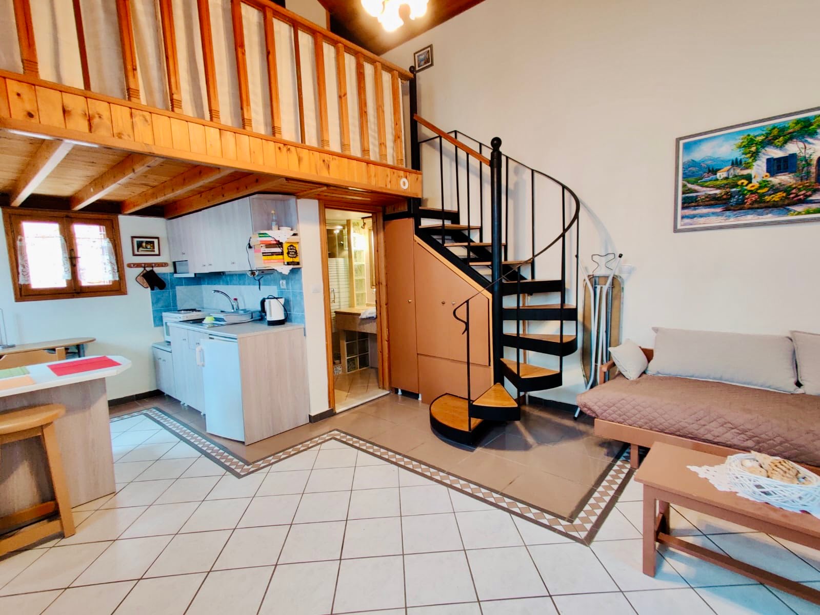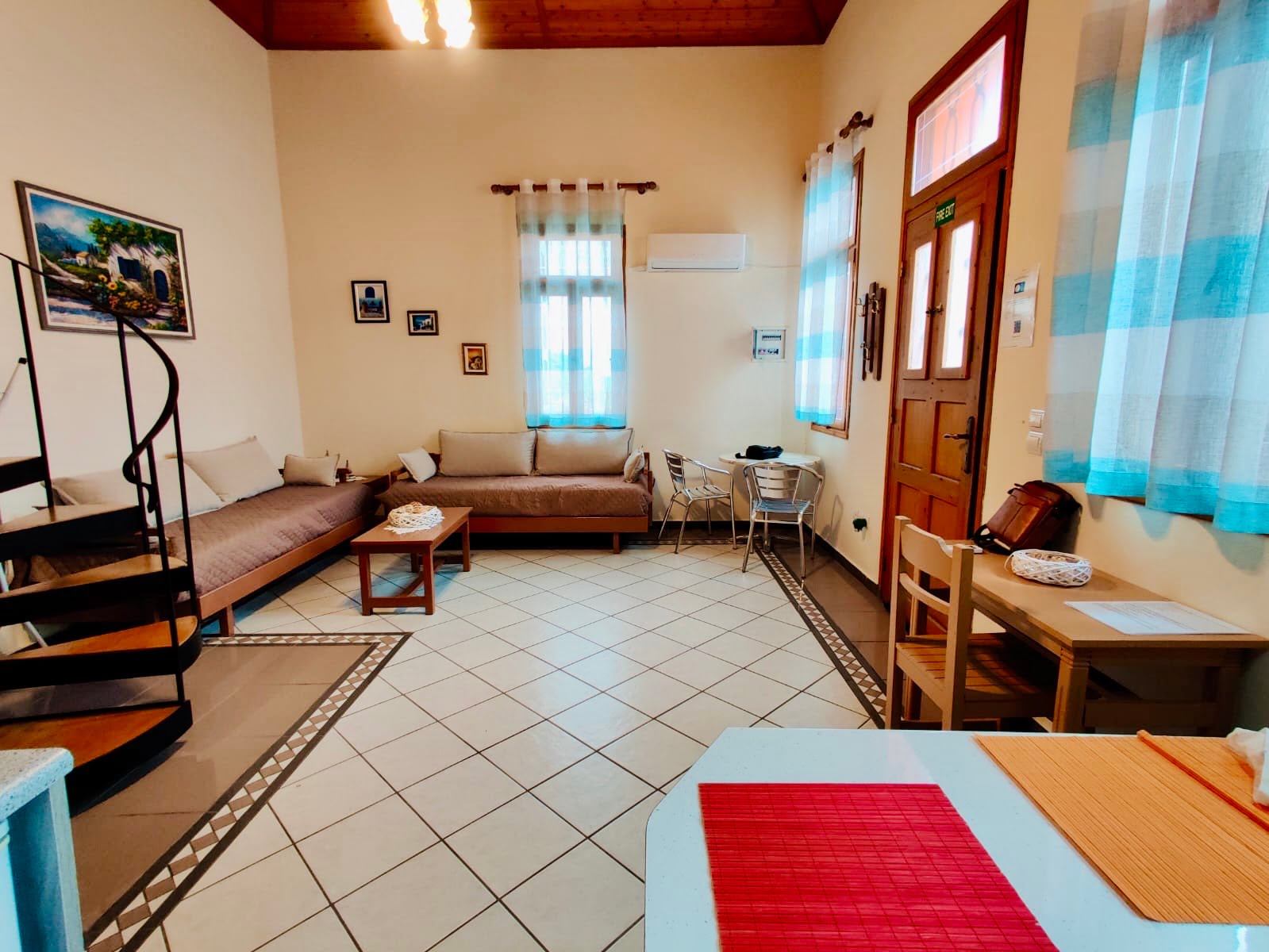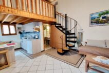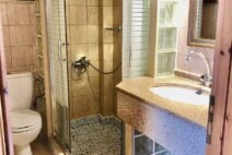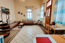 On the ground floor, Villa Nikos features a fully equipped kitchen, a spacious living area with two single beds (which can be joined to form a double), and a bathroom. The mezzanine level hosts a comfortable double bed and an additional toilet for convenience.